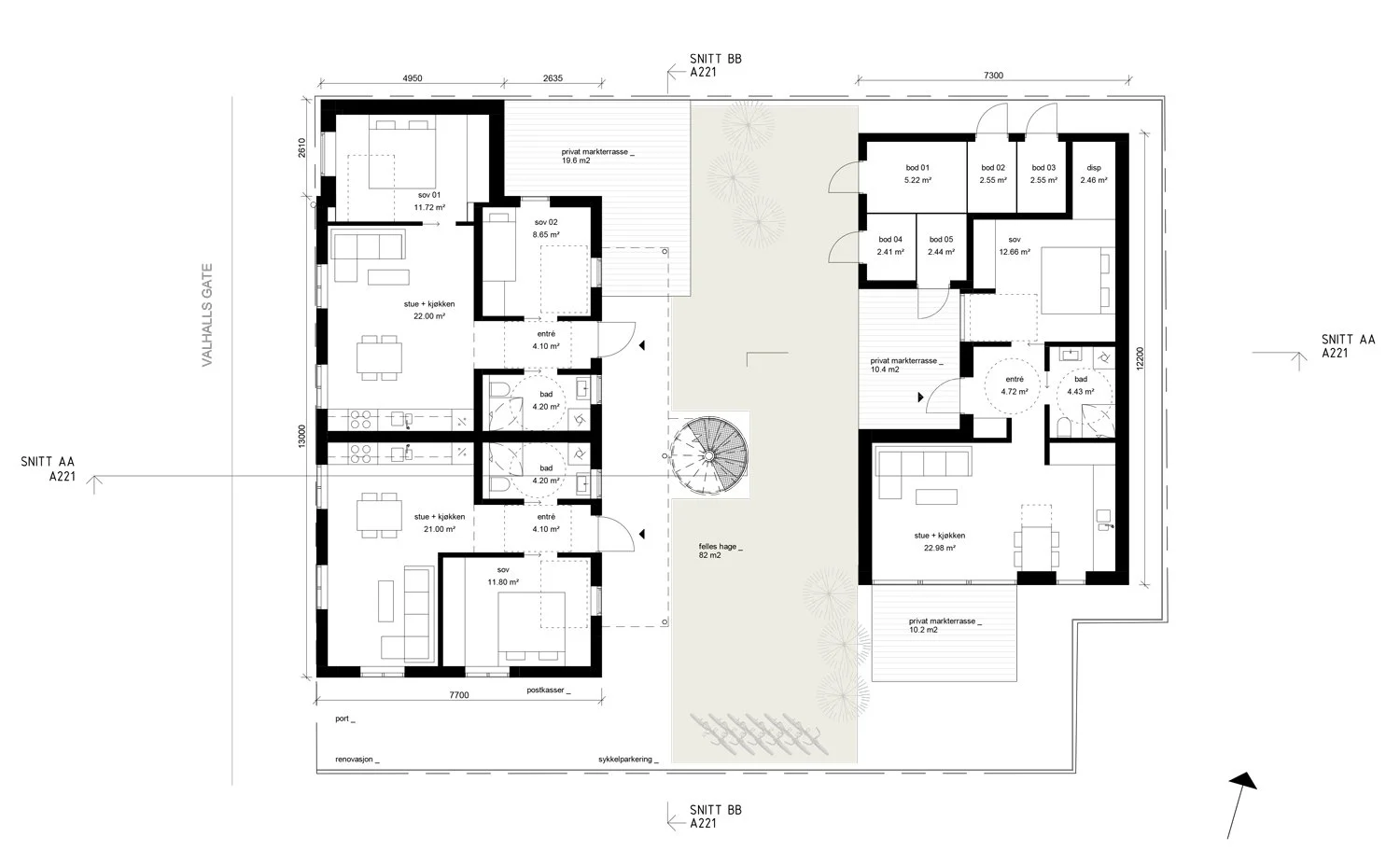 I hovedbygget mot Valhalls gate finner du fire leiligheter der tre av de er på 44m2 med ett soverom og den største er 54m2 og har to soverom.